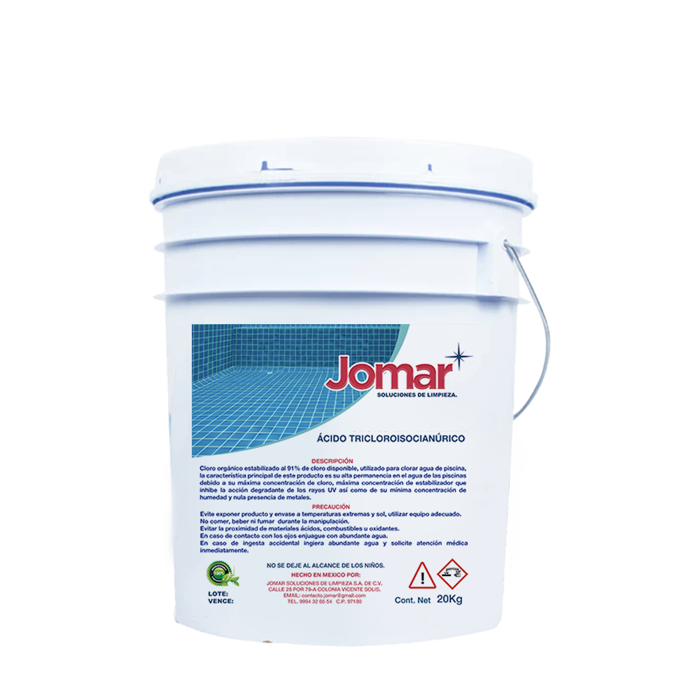 cloro orgánico estabilizado al 91% de cloro disponible, utilizado para clorar agua de piscina, la característica principal de este producto es su alta permanencia en el agua de las picinas debido a su máxima concentración de cloro, maxima concentración de estabilizador que inhibe la acción degradante de los rayos UV asi como de su minima concentración de humedad y nula presencia de metales.