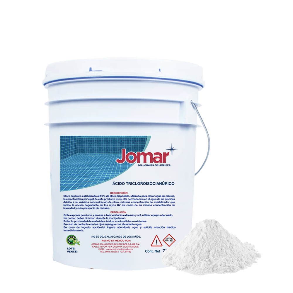 cloro orgánico estabilizado al 91% de cloro disponible, utilizado para clorar agua de piscina, la característica principal de este producto es su alta permanencia en el agua de las picinas debido a su máxima concentración de cloro, maxima concentración de estabilizador que inhibe la acción degradante de los rayos UV asi como de su minima concentración de humedad y nula presencia de metales.