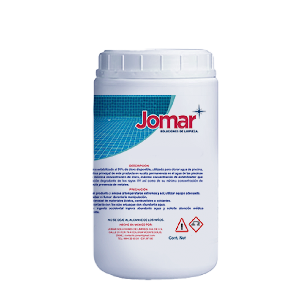 cloro orgánico estabilizado al 91% de cloro disponible, utilizado para clorar agua de piscina, la característica principal de este producto es su alta permanencia en el agua de las picinas debido a su máxima concentración de cloro, maxima concentración de estabilizador que inhibe la acción degradante de los rayos UV asi como de su minima concentración de humedad y nula presencia de metales.